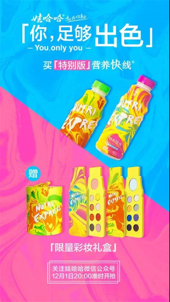 据说这个新包装的营养快线和彩妆盘目前还get不到,将会于12月1日晚8点整在娃哈哈微信公众号中的商城哈宝游乐园限时限量5000份发售。