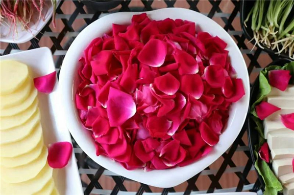 玫瑰在楚雄也是食用非常广泛的花,常被制成点心或甜品,鲜花饼、玫瑰酱、玫瑰酒、玫瑰花饮等,也可与蔬菜和肉类搭配煮玫瑰火锅来吃。小楚最爱的是鲜花饼,香酥的饼皮包裹着香甜的玫瑰花瓣,吃一口回味无穷。