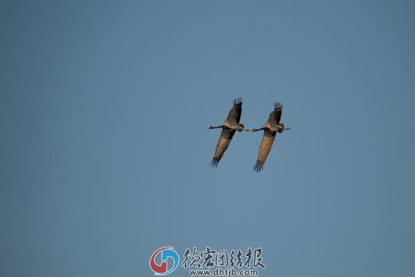 当天下午,志愿者在大盈江边等候黄嘴河燕鸥时,远处有2个黑影飞来并不时发出鹤鸣,志愿者孙冬军大喊一声“有灰鹤”,“哒哒哒哒哒……”瞬间相机快门声连成一片。“不应该啊,这个时间还会有灰鹤,会不会是迷鸟啊……”随着两只鹤飞远消失在山峦和田地间,大家迫不及待地边查看照片回放边说着。“不对,我感觉不是灰鹤,应该是蓑羽鹤。” 志愿者孙晓宏说。“啥?蓑羽鹤?这种鹤这段时间不是应该在内蒙古那些地方吗?”现场气氛一下子热烈起来。随后,志愿者将图片翻拍发给鸟类专家辨别。经几名专家辨别后,确定该鸟种为蓑羽鹤。在查阅德宏鸟类记录资料后,确定本次拍摄到的蓑羽鹤为德宏新记录。