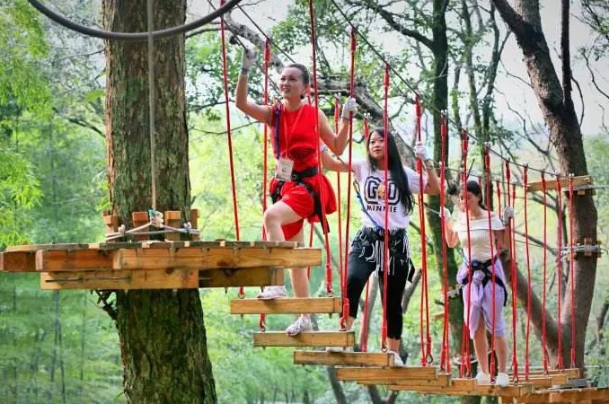 湖边的松林间设置了滑梯、树筒平衡、摇晃梯等32个丛林穿越项目,游客可以置身风光秀丽的大自然中“探险”。