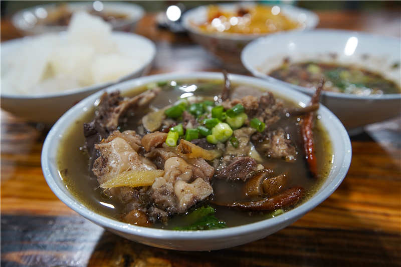 古镇里美食众多,全羊汤锅、炒羊肝、烤羊肉串、苦荞粑粑等彝家风味美食口味独特,原生态的食材加上彝家烹制方法,让你品尝到正宗的彝族味道。