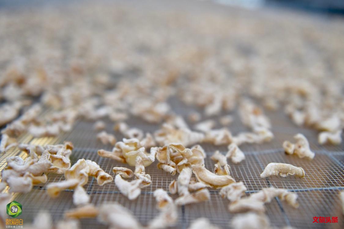 另一个大棚里,在进行木耳阴干。木耳被放在悬空的纱网上,待像茶叶一样卷起来便可打包售出。阴干的茶叶耳好泡发、保持原味,市场价格要高于其他木耳。
