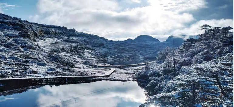 9月27日,轿子山风景区已经漫天雪花飞舞,银装素裹。秋天的轿子山风景区,薄薄云雾笼罩,宛若仙境。