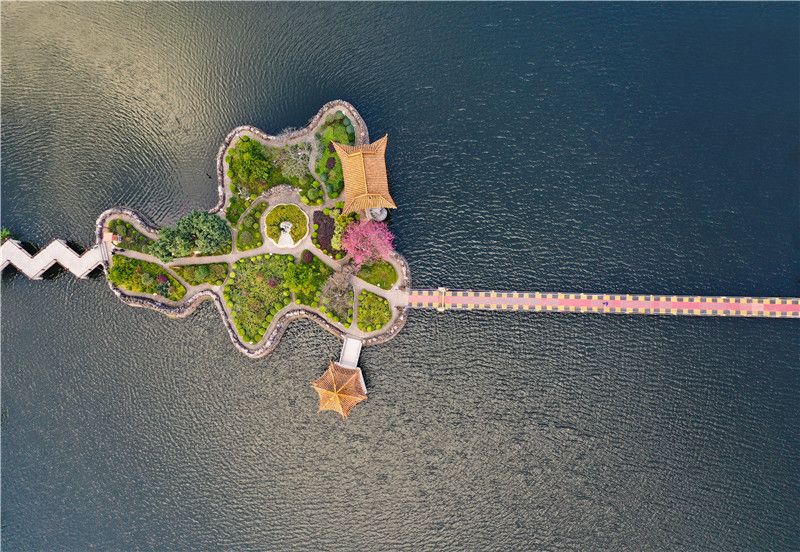 查姆湖中心有一个“湖心岛”,外形根据双柏县的区域外形建造,是双柏县地形图的小型缩版,岛上鲜花锦簇,四季盛开。