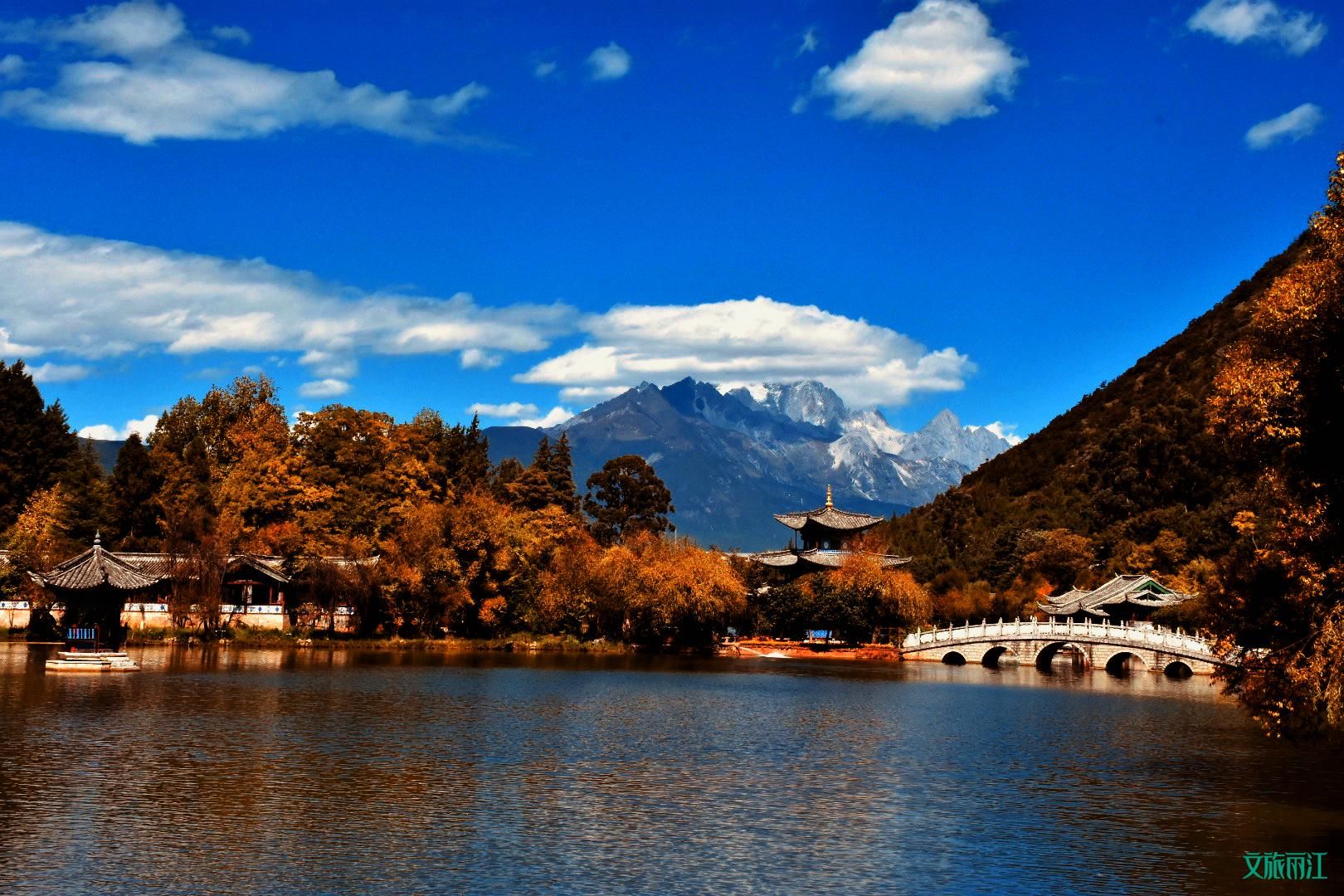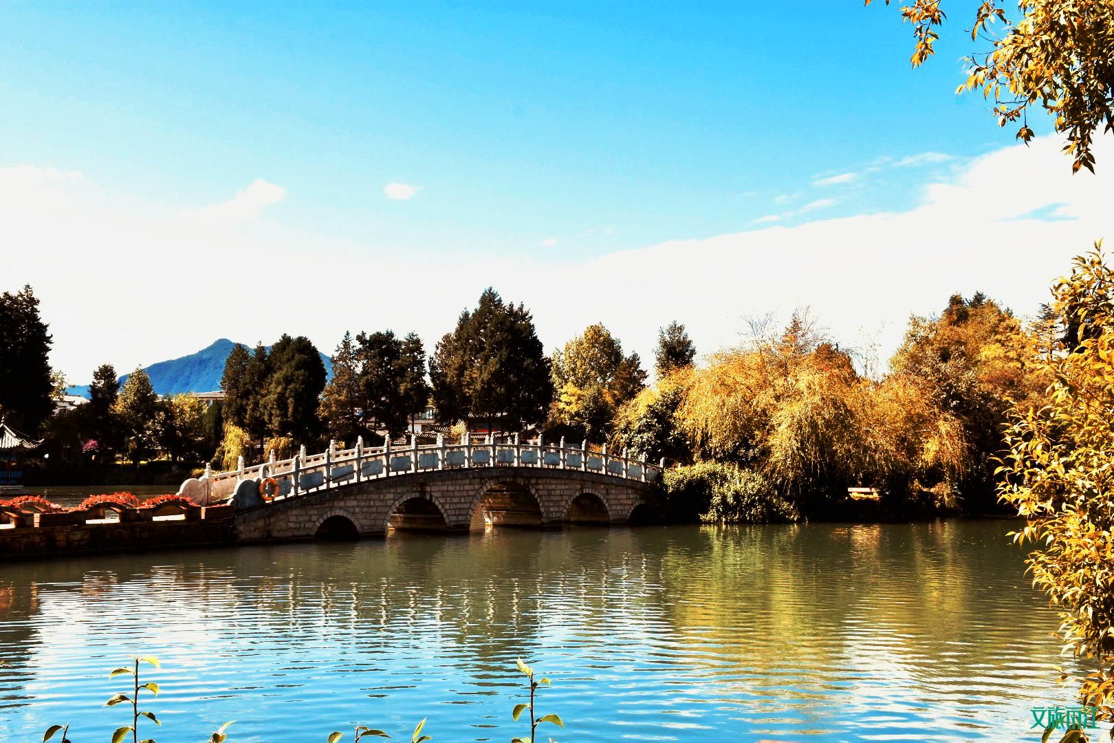 深秋里的黑龙潭,水质依然清澈见底,高耸的玉龙雪山映在如镜的水面,构成一幅绝美的画卷。行走在湖中央的桥上,一阵微风吹来,秋意浓烈。