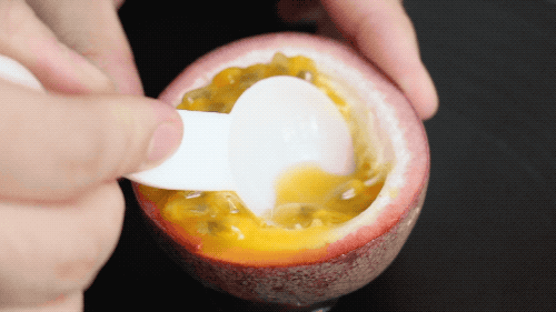 轻轻撕开果皮,一股浓烈的果香会直接扑到脸上,闻起来并非让牙齿抽搐的酸,反倒是沁人心脾的香味。清新、甘甜,带着点微微的酸,百香果的汁水在口腔肆意流淌。而且它还是越放越甜、越皱越好吃!当它的表皮开始发皱,可千万不要嫌它丑,这时的它更好吃更甜!