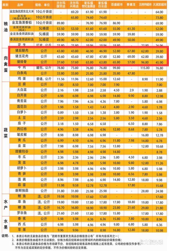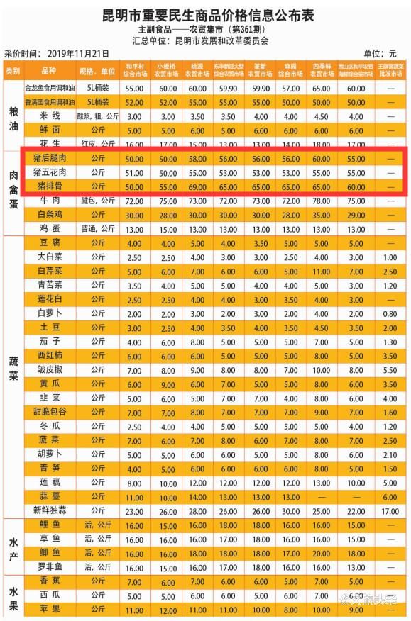 11月21日公布的第361期昆明市重要民生商品价格信息显示,与上周相比,本周8家超市的猪肉价都出现了不同程度的降幅,其中,沃尔玛国贸店的猪排骨每公斤降价28.2元,卖37.6元/公斤;大润发超市的猪后腿肉每公斤降价8元,卖39.8元/公斤。