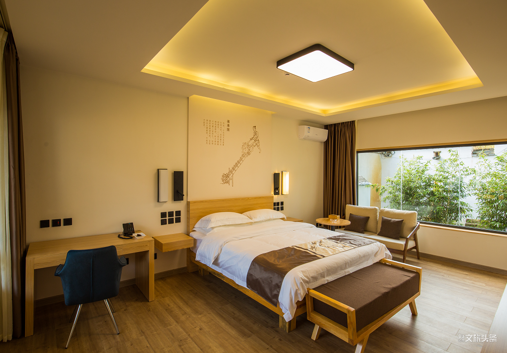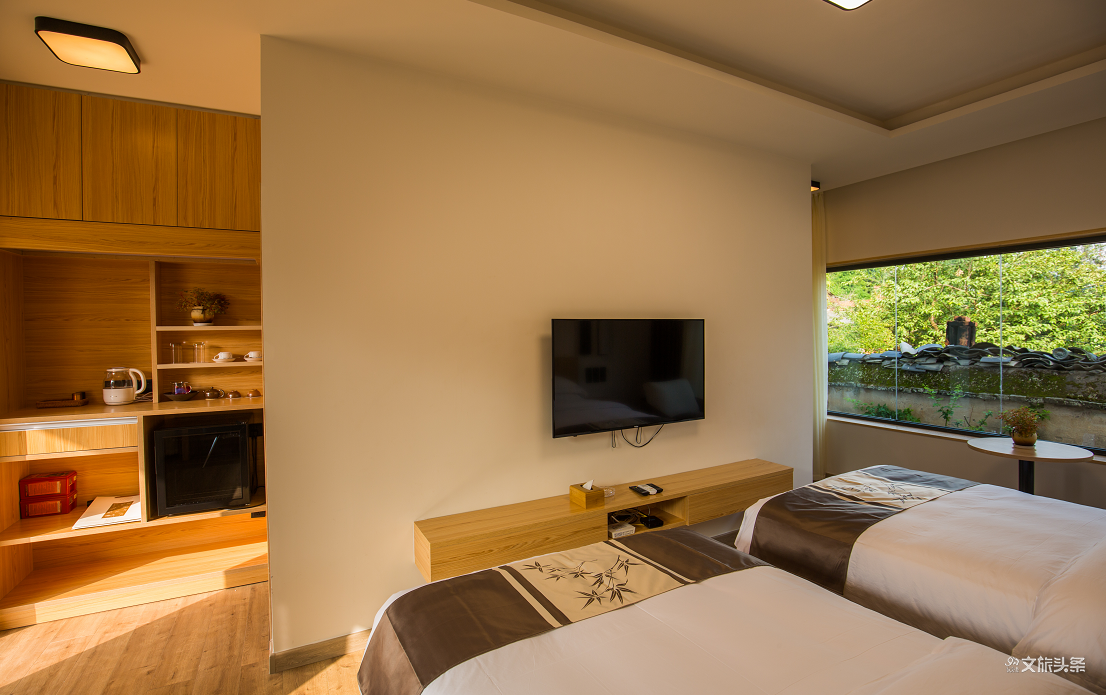 并且,结庐的每间客房光线充足,周边景色宜人。推开古窗,窗外之景宛如一幅幅精美的画卷。远处万里晴空,群山连绵;近处院落静谧清新,葱翠竹林,还有潺潺溪流水声,不绝于耳。每日午后,静靠窗前,便能享受内心宁静,感悟生活。