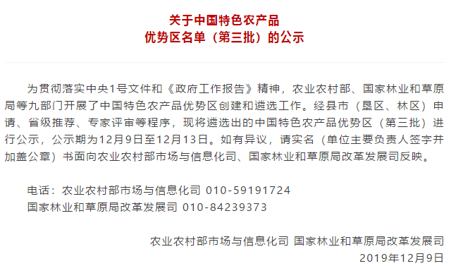 中国特色农产品优势区创建和遴选由农业农村部、国家林业和草原局等九部门组织开展,旨在通过优势区创建促进区域分工,推动产业结构调整,发挥区域比较优势,提高特色产品附加值和溢价能力,同时,加强特色品种保护,加速成果转化应用、产品结构优化和组织管理创新,做大做强特色农业品牌,让传统产业焕发新的活力。