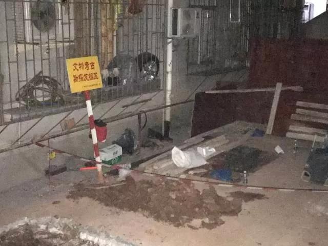昨天(11日)晚上八点左右,南都记者在现场看到,该居民楼为四面环绕型建筑,遗址位于中间天井位置,深约2米,发现汉代古墓的地方已经停工,一侧立有“文物考古勘探发掘区”的指示牌。
