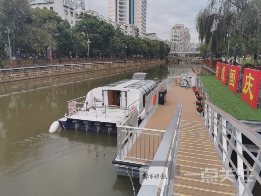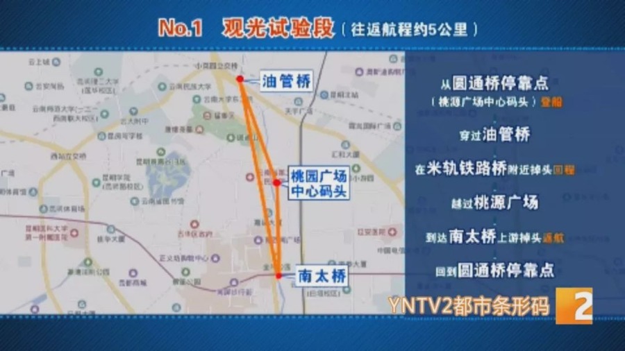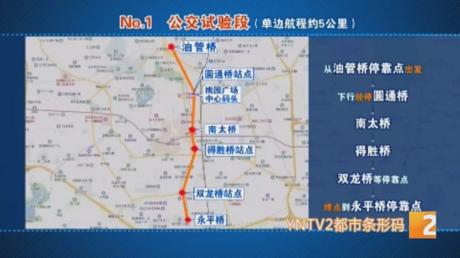 除了观光试验段,还有公交试验段(城市慢行交通体系),乘客从油管桥停靠点出发,下行经停圆通桥、南太桥、得胜桥、双龙桥等停靠点,终点到永平桥停靠点,单边航程约5公里,共设6个公交站点,涵盖南北一环路间的市中心区域。