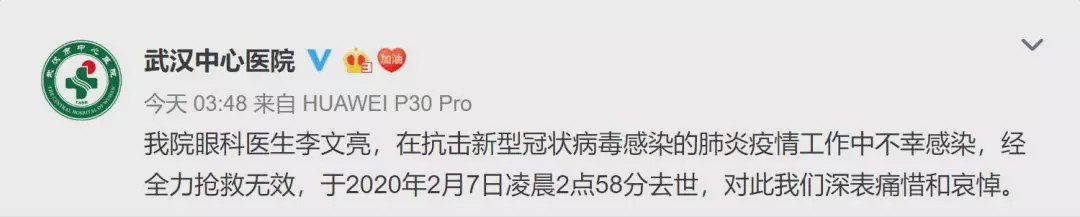 送别李文亮医生 2020-02-07 09:47 新华社 0 据@武汉中心医院 消息:武汉中心医院眼科医生李文亮,在抗击新型冠状病毒感染的肺炎疫情工作中不幸感染,经全力抢救无效,于2020年2月7日凌晨2点58分去世,对此,医院方面深表痛惜和哀悼。 来源:新华社 编辑 沈艺 审核 马永虎