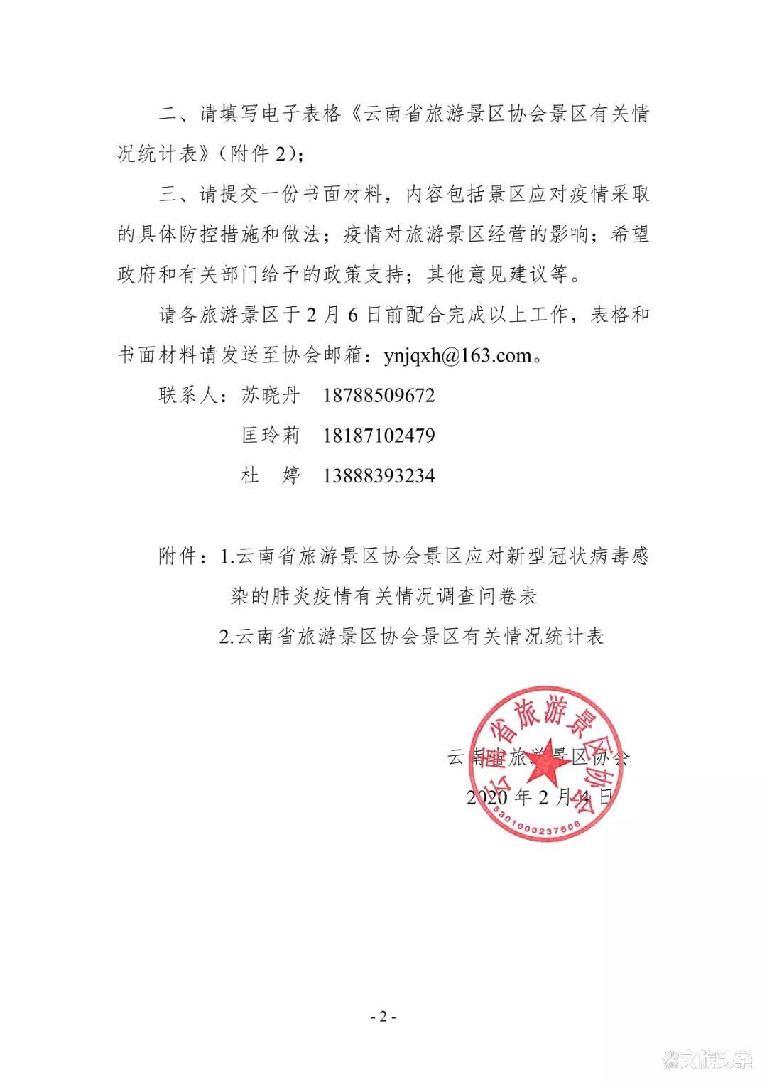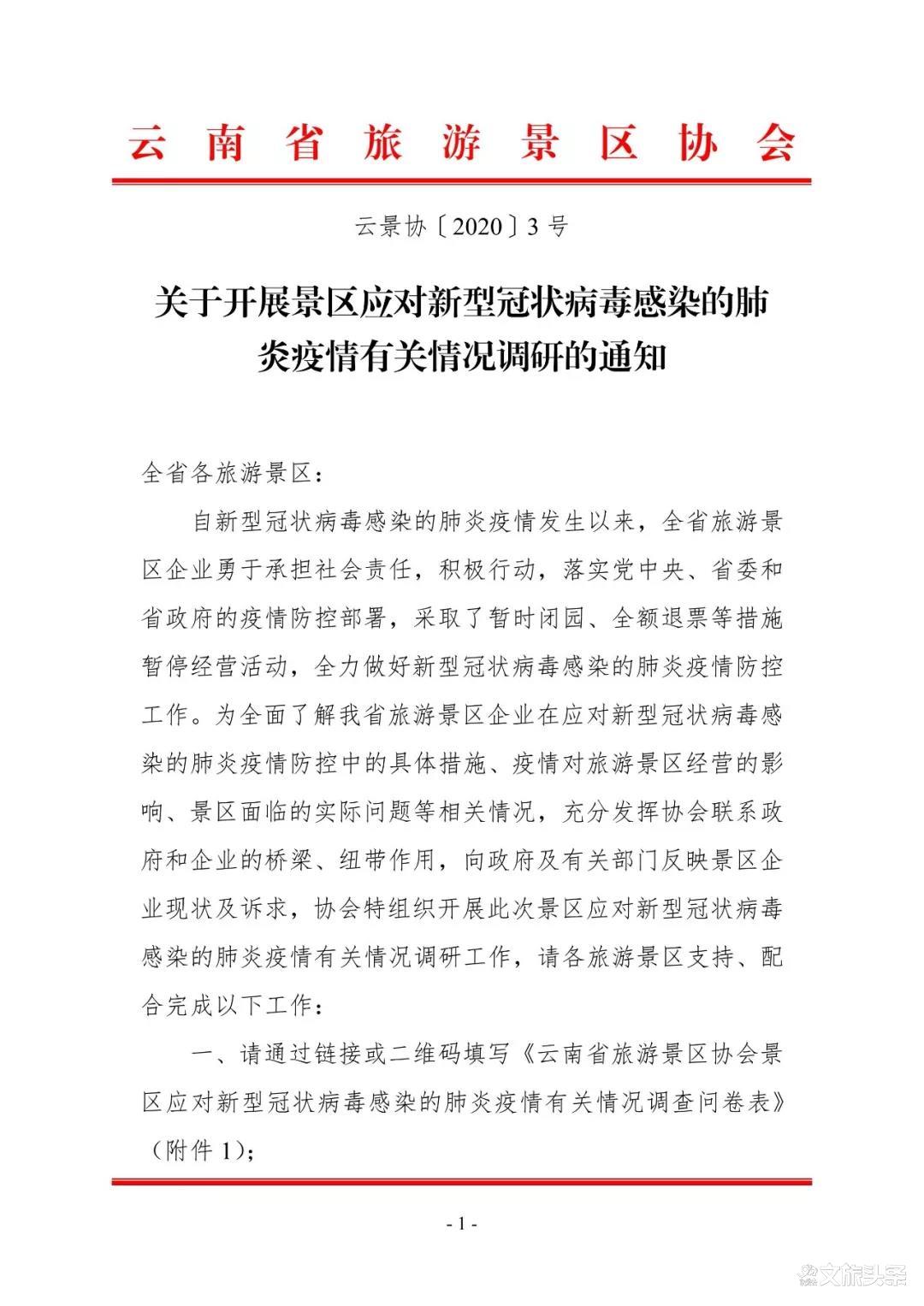 为了全面了解景区疫情防控的先进经验、疫情对景区的影响及景区遇到的实际困难等,云南省旅游景区协会于2月4日向会员单位发布了《关于开展景区应对新型冠状病毒感染的肺炎疫情有关情况调研的通知》,连日来,云南省旅游景区已收到多份各会员景区关于疫情的相关情况。为了保证调研的全面性和准确性,今日(2月7日),云南省旅游景区协会在微信公众号上再发上述通知,将此调研延期到2月10日,各景区可扫描下方二维码,填写调查问卷。待调查问卷结果汇总后,协会将积极发挥联系政府和企业的桥梁和纽带作用,向政府和相关部门反映景区企业现状和诉求,共克时艰。