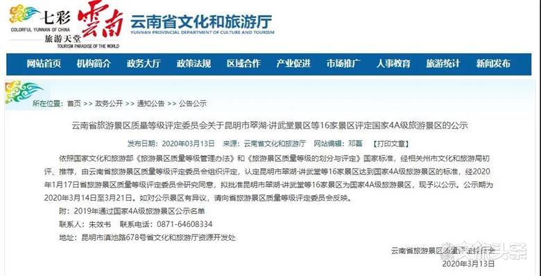 省文化和旅游厅发布的公示中提到,此次被拟定为4A的16家景区,是依照国家文化和旅游部《旅游景区质量等级管理办法》和《旅游景区质量等级的划分与评定》国家标准,经相关州市文化和旅游局初评、推荐,由云南省旅游景区质量等级评定委员会组织评定研究同意,拟批准为国家4A级旅游景区。