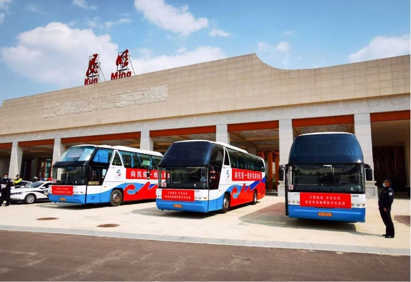 本次用车接待服务,公司提供6辆50座大巴车,接送205人,包括云南第二批援助湖北医疗队102人、第四批援助湖北医疗队102人,以及国家卫健委重症指导专家组中医专家、云南省中医医院医生1人。