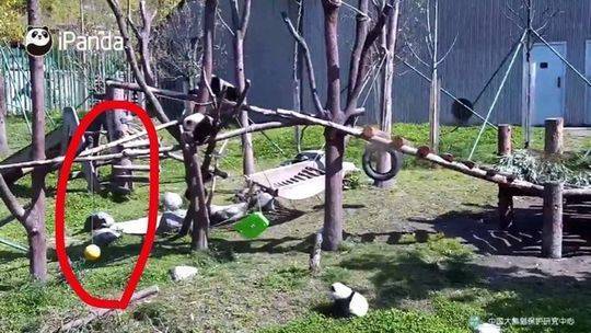 在众多网友提供熊猫死亡时玩耍缠绕的玩具球,原本吊在一个木架上。此时玩具球不见了,木架造型未变。