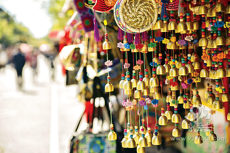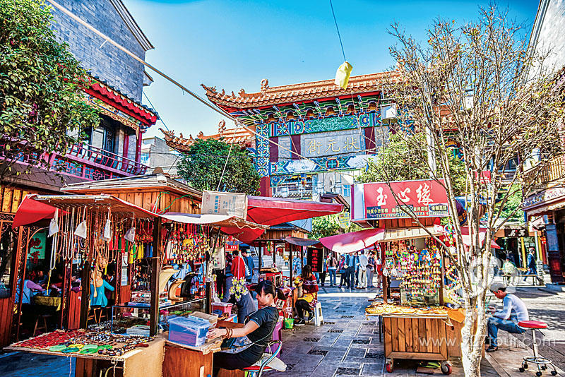 从2000年官渡古镇被昆明市政府列为昆明市首批明星小城镇开始,官渡古镇经过多年“升级”,曾被授予“国际休闲养生古镇”、“昆明十佳传奇小镇”、“中华美食名城·官渡美食文化休闲小镇”等称号,而今年,“云南省特色文化产业示范街区”的荣誉又加冕其上。从广福路边的牌坊进入官渡古镇后,沿着主干道九转花街一直往前。主街两边是特色旅游产品商店,琳琅满目的产品和接踵往来的人群显现出闹市的景象。“官渡古镇分为九区五街。九区分别是品牌餐饮区、民族特色餐饮区、主题酒店区、特色客栈区、时尚娱乐吧区、茶文化区、宗教祈福区、少林功夫表演区、民俗表演区。五街有特色旅游商品街、民族风情街、古玩字画购物街、特色美食小吃街和酒吧一条街。”官渡古镇的管理方,昆明柯润企业管理有限公司的蔺如锦向我们介绍。