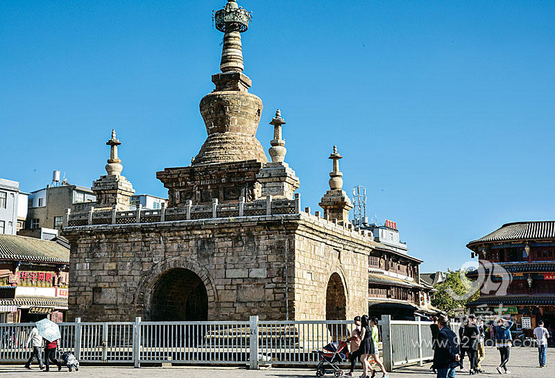 下午的烈日刺得人眯着眼睛行走,一路上多是边抬手遮挡阳光边往前走的游人。小拱桥上的青石板在多年的踩踏下光滑无比,阳光照射其上熠熠闪光。人群如织的广场上矗立着金刚塔、古戏楼、少林寺、双塔等古迹。金刚塔建造方法独特,塔台用糯米饭拌泥在螺蛳壳堆上奠基后全部用砂石砌成宝塔,总高16.05米。古塔在清康熙五年(1666年)地震中塔顶部分毁损,1696年修复,1982年又加修葺,是我国现存建造年代最早、保存最完好的金刚宝座式石塔。“双塔里有一座是因为地震倒塌后在原址上新修的。传说每过一个甲子,双塔的影子就会重合。”