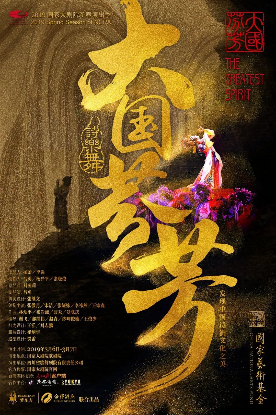 诗乐舞《大国芬芳》选取与中国诗酒相关的历史典故、文学名著、历代名人雅士及诗词佳作,将传统与现代、历史与今天、舞蹈与诗歌、音乐与诗酒有机地融合在一起。全剧以一滴穿越时空的美酒为线索,共分十二个篇章,从“大风起兮云飞扬”的穆穆汉风,到“李白斗酒诗百篇”的盛世长安;从贵妃兴起的婀娜醉态,到红楼金钗的酒令酣畅;从《韩熙载夜宴图》里的觥筹交错,到《清明上河图》中的市井酒肆……一幕幕画卷般的演绎舞出中国诗酒文化之美,带领大家感悟历史,唤醒心中的文化记忆,将这滴穿越千年的芬芳流传于世。