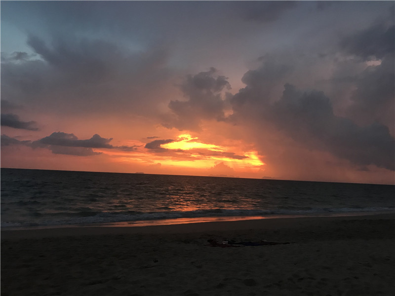 夕阳西下的时候,来到大东海的海滩,海滩边的落日,从遥远的天边发射出太阳的余晖,映红整个天空,选一处不错的视角坐在这里发一整天呆也是幸福的。