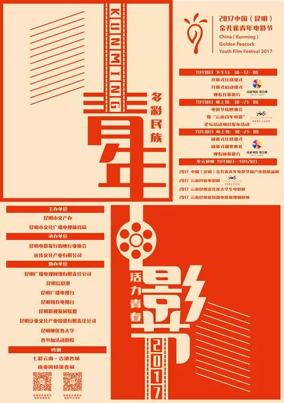 据昆明市文化广播电视体育局电影处处长马齐武介绍,“中国(昆明)金孔雀青年电影节”脱胎于昆明市近几年举办较为成功的“云南民族电影展”和“金孔雀云南昆明大学生影展”,并创新增加了“首届昆明爱情微电影微视频展映”、“2017中国昆明金孔雀青年电影节国产电影精品展”、“云南电影百年论坛”、“金孔雀影视项目孵化和投资论坛”、“大学生电影创作高峰论坛”等多个活动。