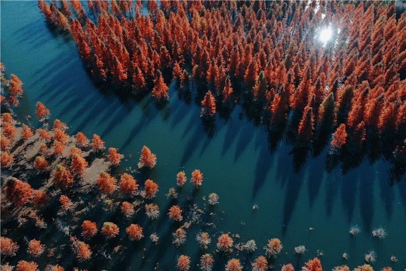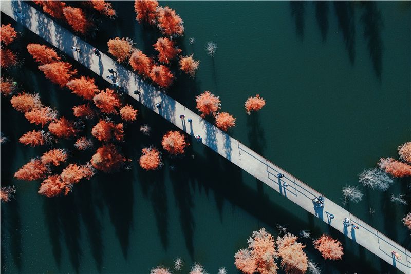 行走在水杉林间,泛黄的树叶一层层地晕染上红色,在阳光的照射下,纤细秀美的枝叶的色彩显得更加明艳。