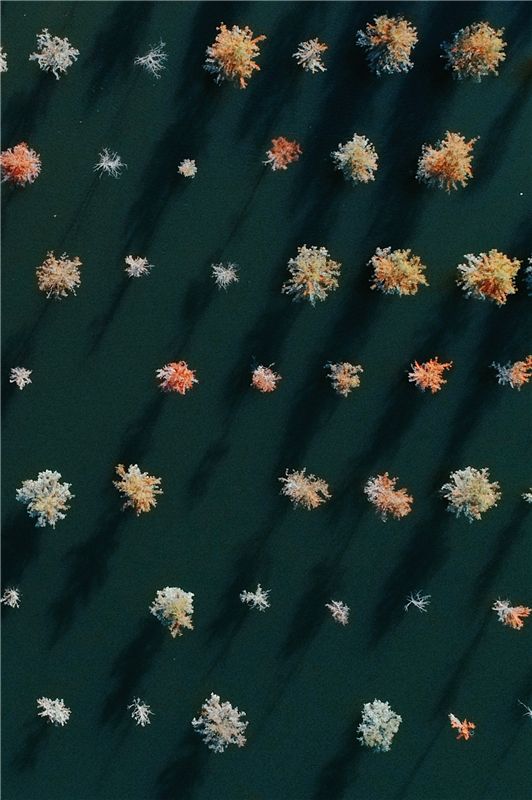 棵棵红杉倒映水中,各种色彩晕染开来,而独自在湖心枯枝上的白鹭,像位看尽世间繁华的老者,默默伫立,不发一言。