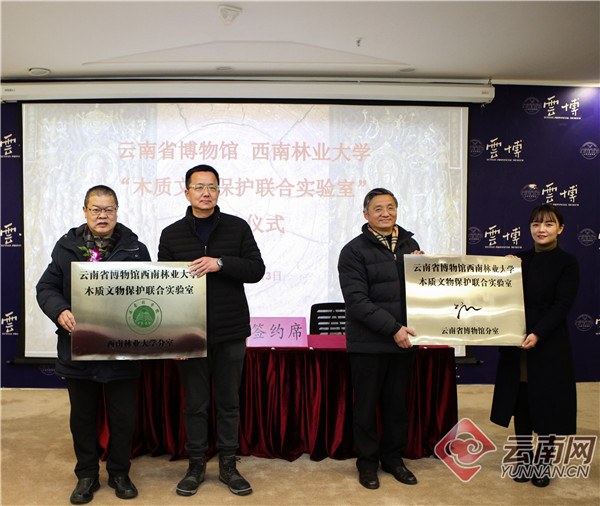 同时,签约仪式现场还为云南省博物馆西南林业大学木质文物保护联合实验室云南省博物馆分室、西南林业大学分室相关负责人进行授牌。