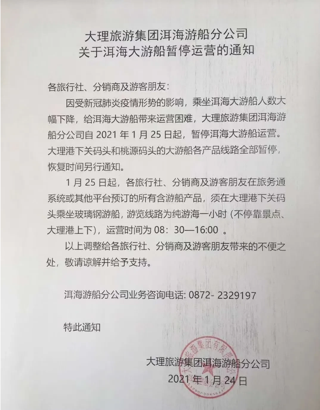 1月24日,大理旅游集团洱海游船分公司发布《关于洱海大游船暂停运营的通知》。通知显示:因受新冠疫情形势的影响,乘坐洱海大游船人数大幅下降,大理旅游集团洱海游船分公司自1月25日起暂停洱海大游船运营,恢复时间另行通知。通知全文如下↓