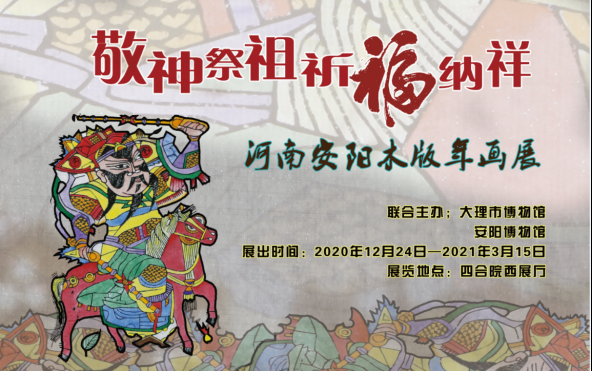 2020年12月24日——2021年3月15日,大理市博物馆联合河南安阳博物馆在市博物馆四合院西厅举办《敬神祭祖祈福纳祥——河南安阳木版年画展》。展出以神像、装饰画和祖谱等为代表性内容的50张豫北地区木版画藏品。木版画是一种有着一千多年历史、富有中国特色的传统民间艺术。河南安阳滑县木版画创始于明初,鼎盛于清,现已列入国家级非物质文化遗产保护名录。展览通过喜庆、吉祥的年画主题,直观地感受中原历史文化和豫北传统民俗,体会中华传统文化的博大精深和源远流长。