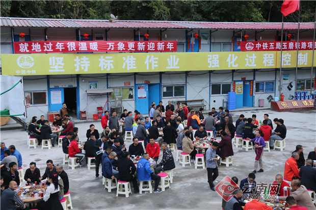 2月11日下午17时55分,安定隧道1号斜井五队驻地场地上响起了噼里啪啦的鞭炮声,平时拥堵的停车场摆放了16张饭桌,牛年年夜饭开始啦。