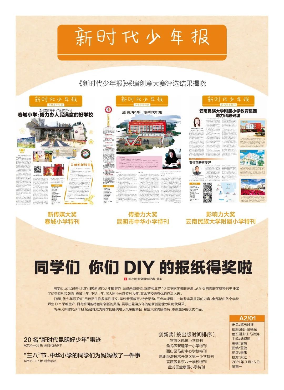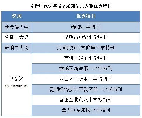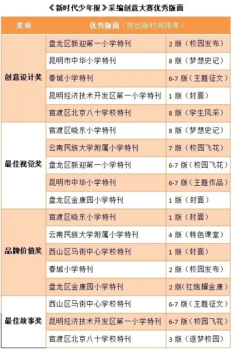 3月12日,《新时代少年报》采编创意大赛专家定评会在昆明市新闻中心举办,27件优秀特刊和优秀版面获奖。春城小学、中华小学、民大附小分获特刊大奖,其余学校也有优秀作品入选。经过评委会专家线下定评,优秀特刊获奖情况如下: