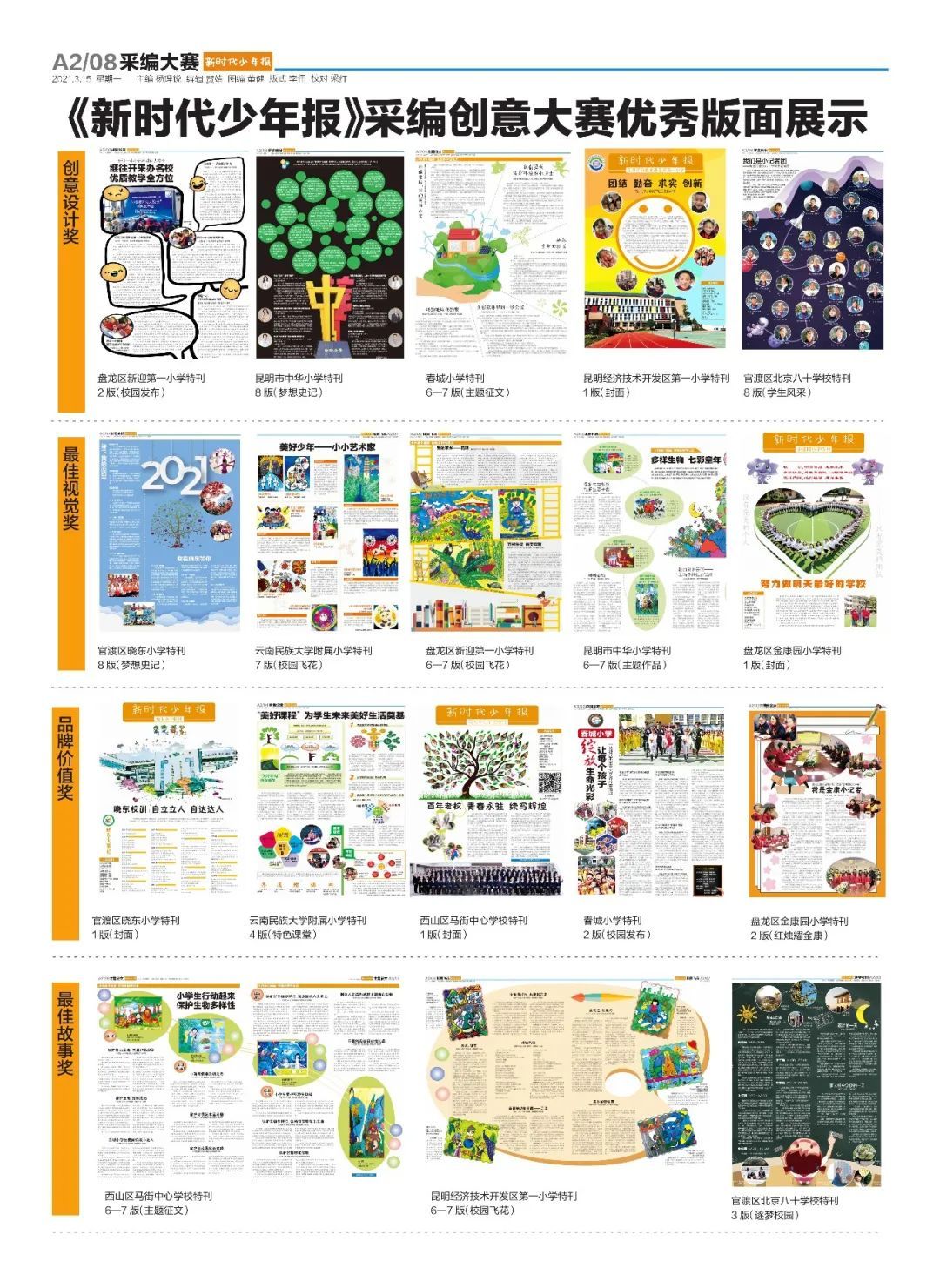 《新时代少年报》采编创意大赛自2021年1月启动以来,先后在晓东小学、民大附小、新迎一小、马街中心学校、中华小学、春城小学、经开一小、官渡区北京八十学校、金康园小学9所小学开始比赛,制作出精美的学校特刊。