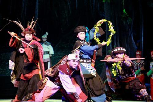 傣戏,也叫傣剧,发展和完善主要在德宏一带,因此傣戏又称“滇西傣戏”。傣戏大约在十九世纪初产生于德宏的盈江。允哏傣戏主要传承了盈江傣族创立和改编的傣戏剧目,有《飞铜飞铁》、《台天》、《王反祖》、《陈德陈东》、《十八吵闹》等剧目,表演形式主要是以象脚鼓、铓锣、钹为主的多种乐器伴奏,并采用了滇剧不少以锣鼓经为主的伴奏手段,演唱用傣戏唱腔,有说唱、对白、动作比划等。