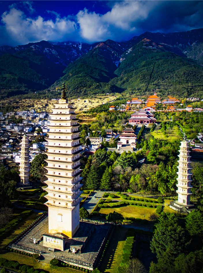 三塔主塔名千寻塔,另有两个小塔分列南北,三塔鼎足、浑然一体。千寻塔现存高度69.13米,底宽9.9米,是中国现存座塔最高者之一,与西安大雁塔、小雁塔同为唐代典型塔式。三塔是妙香佛国的千古见证,也是大理的标志和象征。