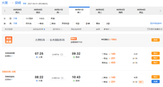 从行程看,大理至昆明出发时查询的动车票价格最低为145元。