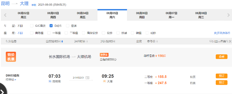 从行程来看,昆明至大理查询的动车票价格最低为155.5元。