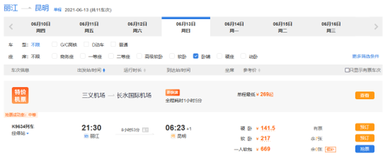 从行程看,丽江至昆明火车卧铺价格最低为141.5元。