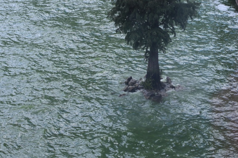 一声“出发”打断了我的神思,这可不是百年树人,而是百年树木,其苍古不得不令人深思。走平坦路那是偶然,下坡却是必然。两株横倒悬于路上的冷杉,长约十余丈,根仍紧紧抓牢悬土,夹挟一绿色椭圆石,象玉。近一细看,顶端枝叶鲜绿,令我大吃一惊。我不得不惊叹,其能笑对人生的升降浮沉,能宠辱不惊、安享心灵的平静幸福。令人想起佛家的一句妙语:“人最大的幸福是放得下。”面对这两株横倒悬于路上的冷杉,我肃然起敬、默默注目……