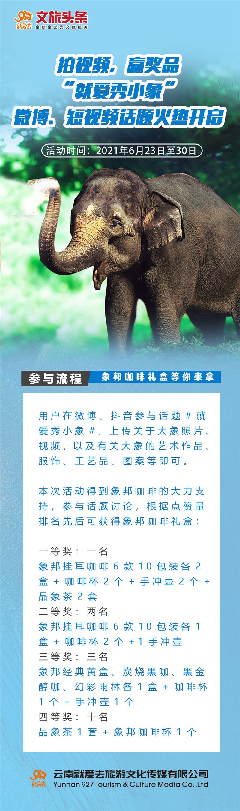 为提升公民生态文明意识,唤起更多人关注亚洲象保护,展现人与自然和谐相处、共享生态美景的画面;云南日报报业集团云南就爱去旅游文化传媒有限公司特发起#就爱秀小象#微博、抖音话题活动。活动向全网征集大象照片、视频,以及有关大象的艺术作品、服饰、工艺品、图案等,只要是有关大象形象正能量的图片或视频,你都可以通过参与话题秀出来。