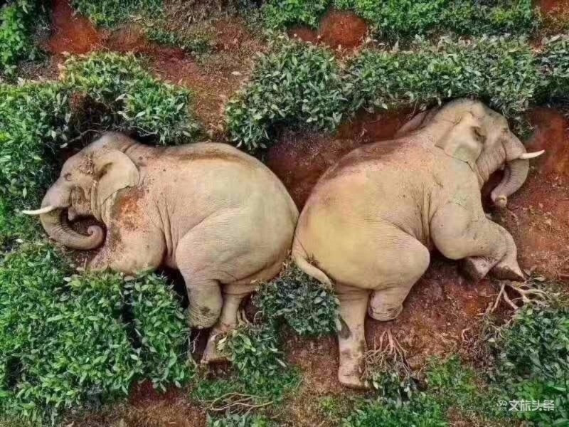 2020年,江城县还出现过野象背靠背睡在茶园中的趣景。当时,两头野象吃饱喝足之后,在茶园里一阵酣睡,又萌又可爱,全然不顾已经被人偷拍。这两头野象的“不雅”照片“曝光”之后,引无数网友惊呼,“普洱的野象太也太好在了嘛!”这样的慢生活,着实令人“象”往。