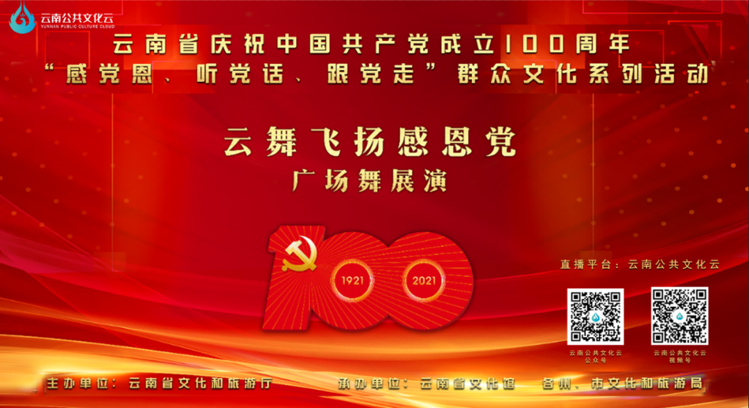 搜索“云南公共文化云”(https://wap.ynggwhy.cn/live/detail/1408412069044834304)→点击菜单栏【庆祝建党100周年“感党恩、听党话、跟党走”群众文化活动 “云舞飞扬感党恩”广场舞展演】观看