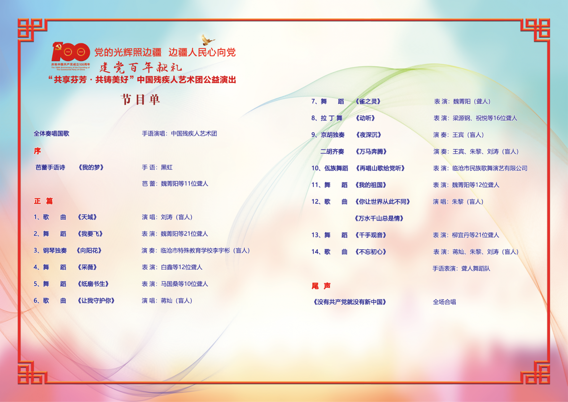 据了解,每年的国际残疾人日,中国残疾人艺术团都会在北京举行专场演出。今年,为庆祝中国共产党成立100周年,让党的光辉照耀边疆,与边疆人民共享艺术成果,中国残疾人艺术团首次把这个舞台搬到祖国的边疆——临沧。作为艺术团最重要的演出之一,此次艺术团派出了最强演出阵容,与临沧市民族歌舞演艺有限公司、临沧市特殊教育学校一起为临沧人民送来一场饕餮艺术盛宴。不仅有《千手观音》《雀之灵》等经典舞蹈,还带来了庆祝建党百年的节目,如舞蹈《再唱山歌给党听》、《我的祖国》歌曲《不忘初心》等节目。