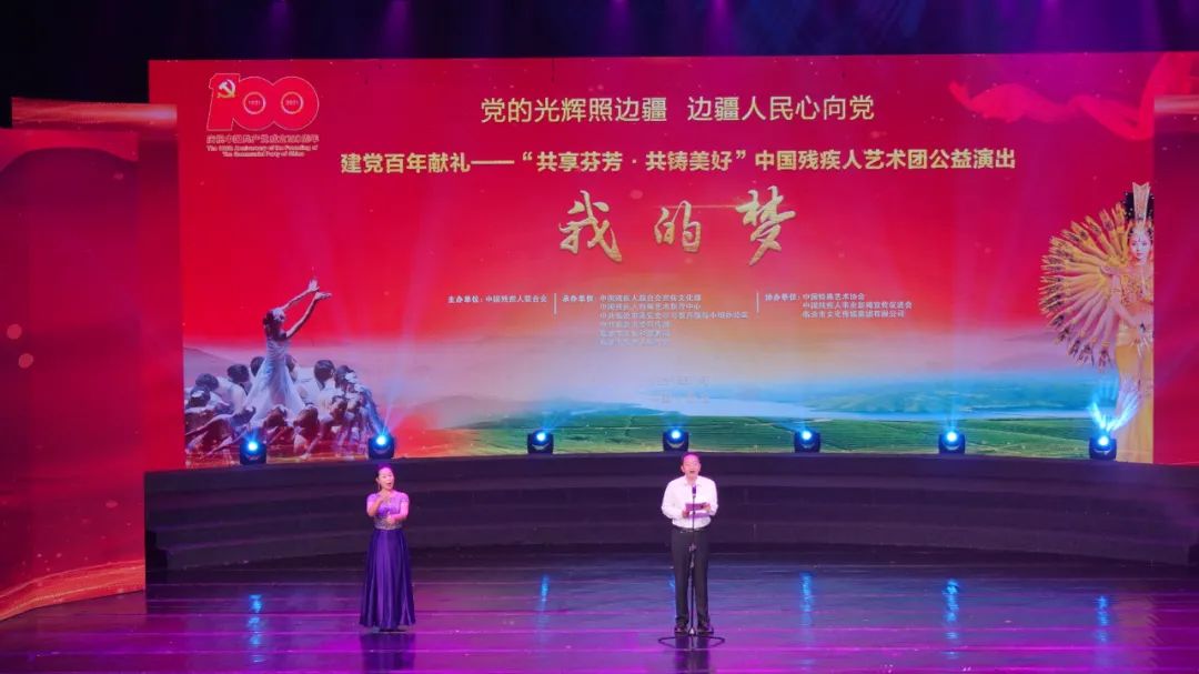 7月4日晚,党的光辉照边疆 边疆人民心向党——“共享芬芳·共铸美好”中国残疾人艺术团《我的梦》公益演出在临沧市亚洲微电影院举办,庆祝中国共产党成立100周年,让党的光辉照耀边疆,与边疆人民共享艺术成果,共享芬芳铸美好,扶残助残传大爱。