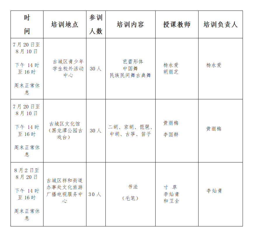 (一)舞蹈培训班舞蹈培训内容:芭蕾形体、中国舞、民族民间舞、古典舞。古城区范围内年龄7岁—12岁青少年(农民工子女优先),需自带舞蹈鞋和练功服。