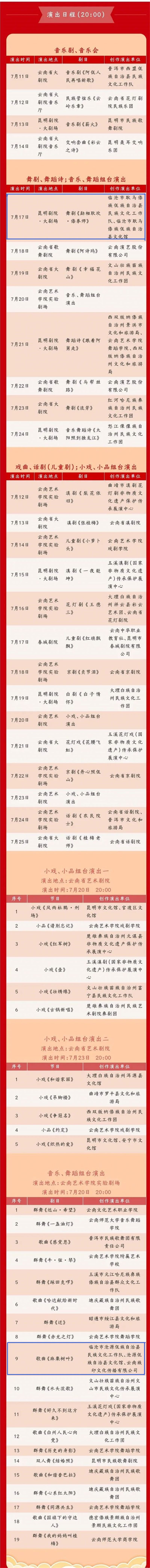 经过专家评审,共有23台剧目、30个小节目入选本届展演,将分别在昆明的云南省大剧院、云南艺术剧院、昆明剧院、春城剧院、云南艺术学院实验剧场、云南省歌舞剧院梦幻剧场等6个剧场演出。演出采取“文化惠民”的低票价模式,让人民群众共享文化艺术发展成果。参展剧(节)目涵盖了京剧、滇剧、花灯、白剧、音乐剧、舞蹈诗、舞剧、交响乐、民族音乐会等多个类别,艺术门类齐全,主题鲜明、内容丰富、形式多样。