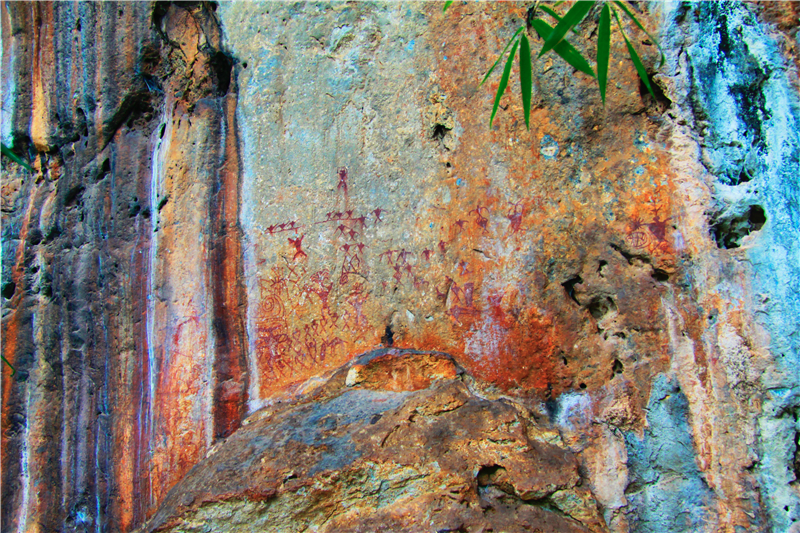 到达崖壁,看到崖画的一刹那,佤族先民们狩猎、放牧、舞蹈、祭祀的一幕幕生活场景跃然眼前,犹如时光穿越。崖画几乎概括了原始氏族社会从旧石器时代向新时器时代过渡后,从渔、猎、采集经济发展到驯化动物和培植植物的社会生活画面,让人心生震撼,全然忘记爬山的疲惫。
