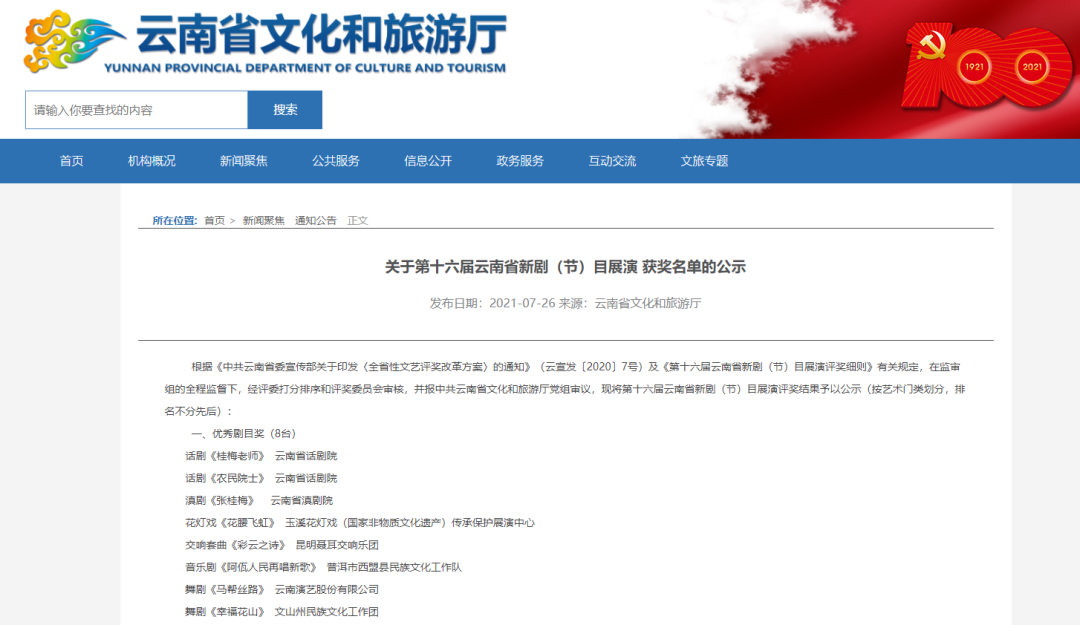 7月26日,云南省文化和旅游厅发布了关于第十六届云南省新剧(节)目展演获奖名单的公示。公示时间为2021年7月26日—30日。(来源:云南省文化和旅游厅)