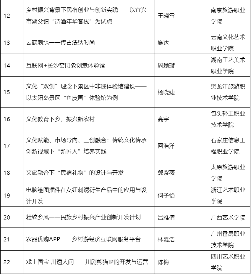 其中,云南文化艺术职业学院申报的“云鹤刺绣——传古法绣时尚”、云南旅游职业学院申报的“运动营养创业实践工作室”、云南旅游职业学院申报的“鲜花伴礼游云南”3个项目入选大学生团队实践扶持项目;云南旅游职业学院申报的“职业教育校企“双元”合作新形态教材开发路径——以《旅游服务英语》教材开发为例”、云南财经大学中华职业学院申报的“专业竞赛与展会参与的“双轮驱动”实践教学行动研究”2个项目入选“双师型”师资培养扶持项目;云南财经大学申报的“乡村旅游开发中外来资本与乡村社区的合作引导机制研究——基于演化博弈视角”项目入选专业研究生重点研究扶持项目MTA类项目。