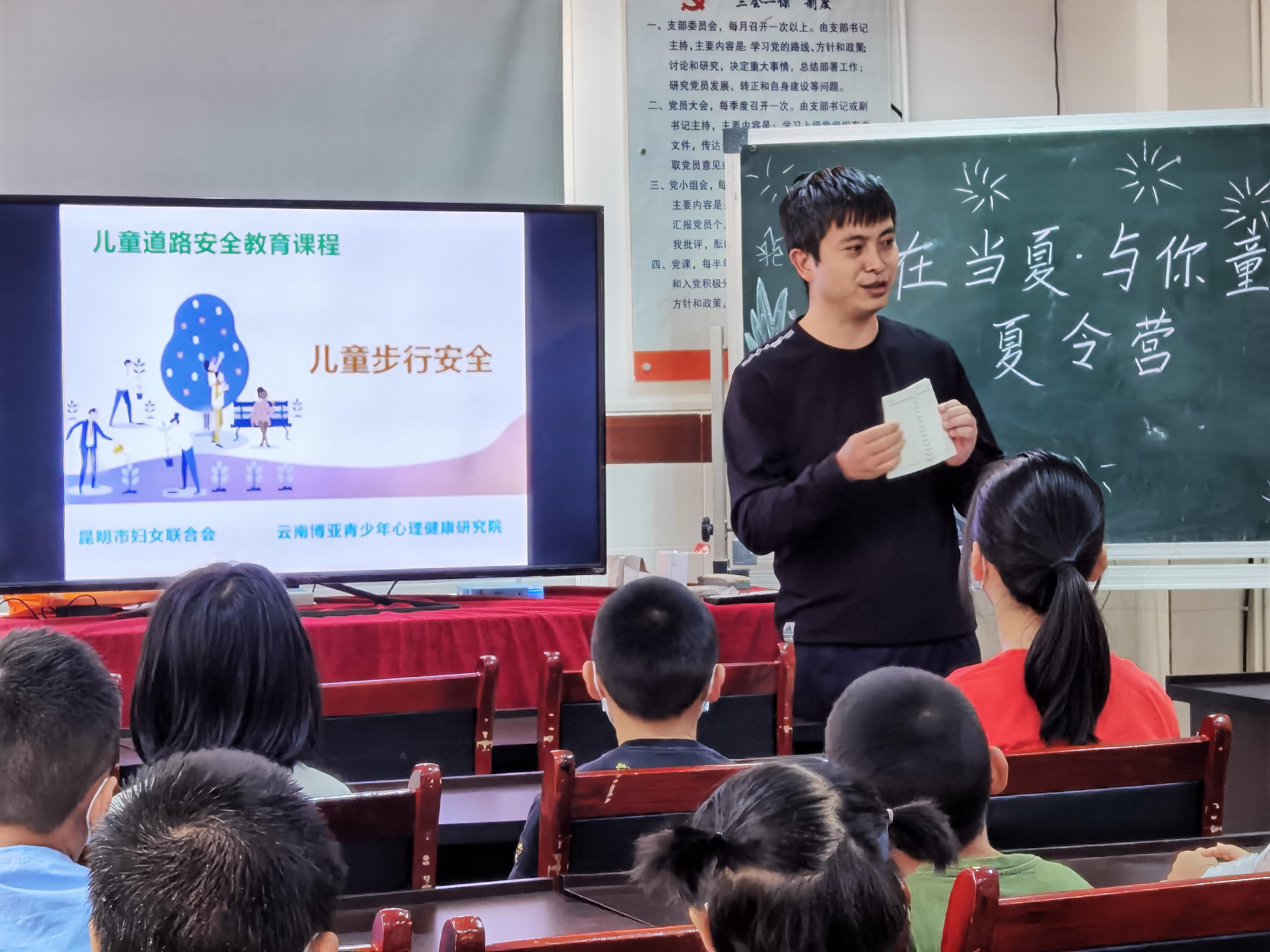 棕树营南区社区联合云南博亚青少年心理健康研究院、棕树营派出所在“儿童之家夏令营”中开展未成年人安全知识培训和交通安全知识培训活动。王衡警官根据当前的社会治安形势,通过事例讲述和视频动画的方式就未成年人的家庭保护、学校保护、社会保护、网络保护等情况进行了详细讲解,还现场向孩子们介绍警察日常工作中使用的反恐八件套装置。